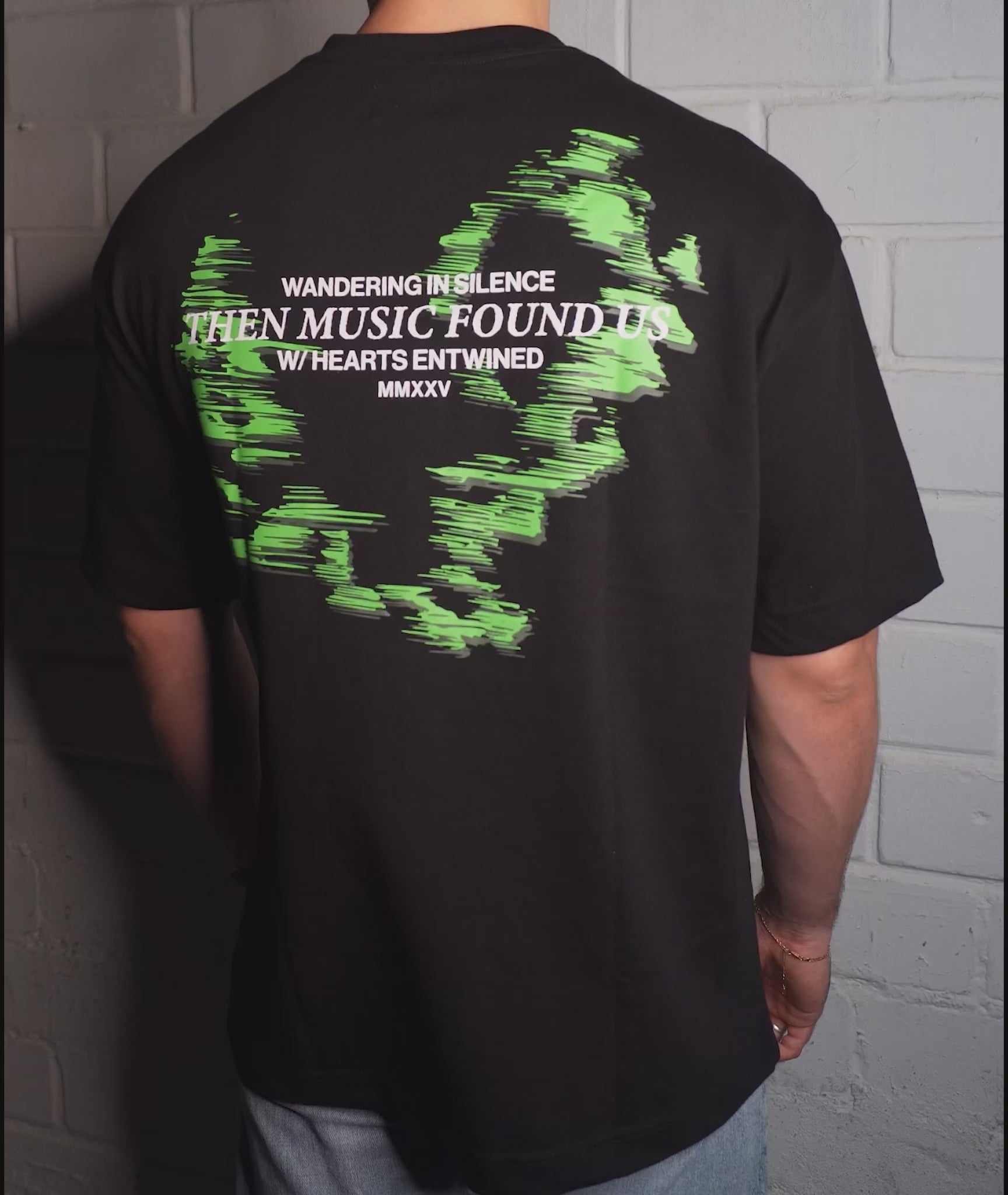Camiseta oversized em algodão premium 260GSM com gola de 3,5 cm e caimento estruturado. Estampas em silk trazem grafismos vibrantes inspirados no universo dos clubs. A arte representa a sintonia única que conecta duas pessoas através da música, com contraste de tons de verde vibrantes.